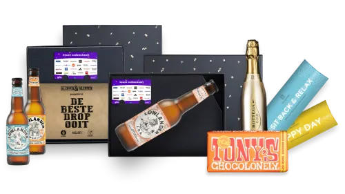 Maak je zakelijke cadeau extra speciaal door het te combineren met een luxe cadeaupakket. Voeg een heerlijk product toe, zoals Portugese wijn, Lowlander bier, Tony’s Chocolonely chocolade of Klepper & Klepper drop. Een goede én smakelijke manier om je waardering extra te tonen.