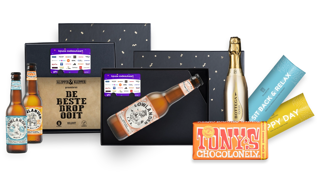 Maak je zakelijke cadeau extra speciaal door het te combineren met een luxe cadeaupakket. Voeg een heerlijk product toe, zoals Portugese wijn, Lowlander bier, Tony’s Chocolonely chocolade of Klepper & Klepper drop. Een goede én smakelijke manier om je waardering extra te tonen.